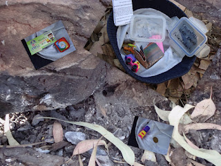 Como suele pasar, durante 10 minutos no encontré el mentado geocache y, cuando ya me estaba dando por vencido, me imaginé por un momento donde lo pude haber escondido en tres metros a la redonda de donde me encontraba y... efectivamente, lo encontré debajo de unas cortezas y una piedra al pié de un árbol hacía la pequeña barranca que estaba frente a mí.